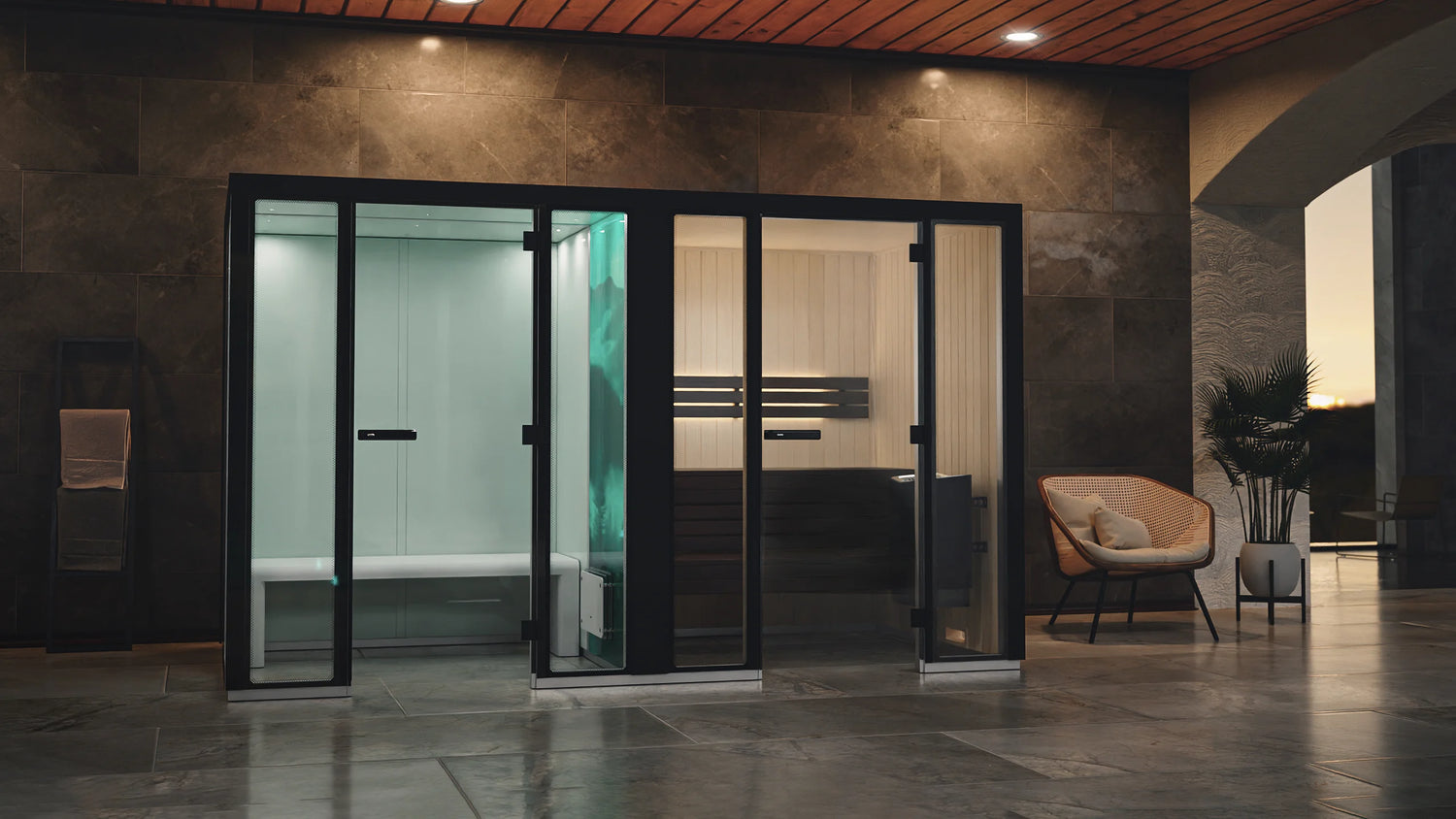 Impression saunaklefarnir frá Tylö taka eins lítið rými og hægt er, eða frá 1,3m2. Þessi saunalausn getur búið yfir bæði hefðbundinni saunu og saunu með þýðari gufu.